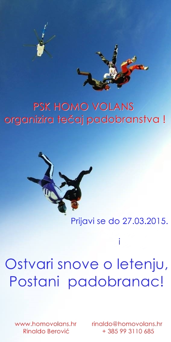 U padobranskoj školi Homo volans, 28. ožujka 2015. godine počinje novi padobranski tečaj za sportskog padobranca. Više informacija na +385 99 3110 685, mail: rinaldo@pskhomovolans.hr, ili na sljedećem linku: škola